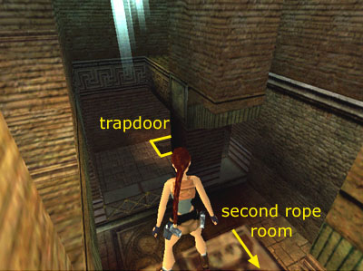 Turn right (the ladder is now on Lara's left) and take a running jump to the next ledge. Jump around the column to the small, square ledge and enter the FIRST ROPE ROOM. Pull the vertical rope (stand facing it and press Action) to operate the gear mechanism. Do this three times.