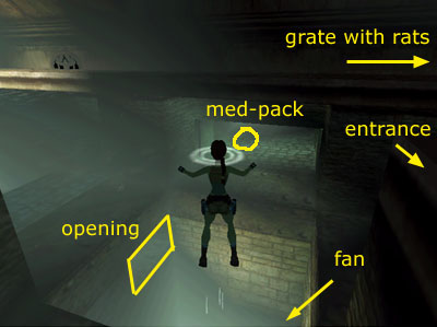 SEWERS: Drop through the trapdoor and follow the short passage to a T-shaped pool. One of the semi-circular grates (the one in the far right corner from the entrance) releases a swarm of rats when Lara walks past, but you can avoid it easily. At the junction of the various spokes of the pool, is an underwater fan. Beyond it, on the bottom of the pool is a small medipack (21). There are two openings on the side walls of the shaft that leads down to the fan. The current prevents you from reaching the lower opening. (This area is shown in the screenshot here.)