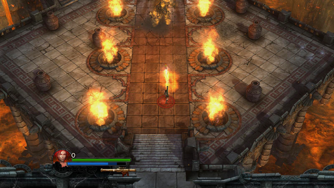 ROOM WITH PRESSURE PAD AND TALL COLUMNS (again): Two skeletons greet you at the bottom. Deal with them before venturing farther into the room. When you approach the columns, a fire golem and a swarm of red lizards appear. Use a powerful weapon like the rocket launcher or high-power, single-shot rifle on the golem. Then switch to something with a faster fire rate to finish off the lizards. Return downstairs past the falling lava to the MAIN ROOM. Again, there are a couple of new urns with ammo if you need a top-up.