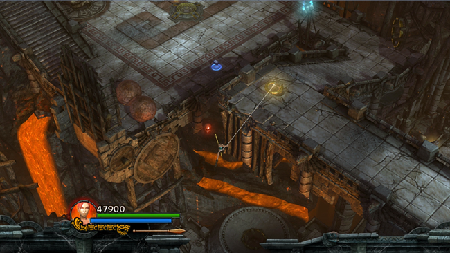 Now roll the ball to the edge of the lava stream, just across from the burners where you got the upgrade. Plant a bomb just behind the ball to blast it onto the burners. After you've upgraded your bombs a bit, it may be possible to blast the ball all the way across to the opposite side of the room. But it's OK if you don't manage this. As long as the ball ends up on the far side of the burners, as shown above, you're good to go.