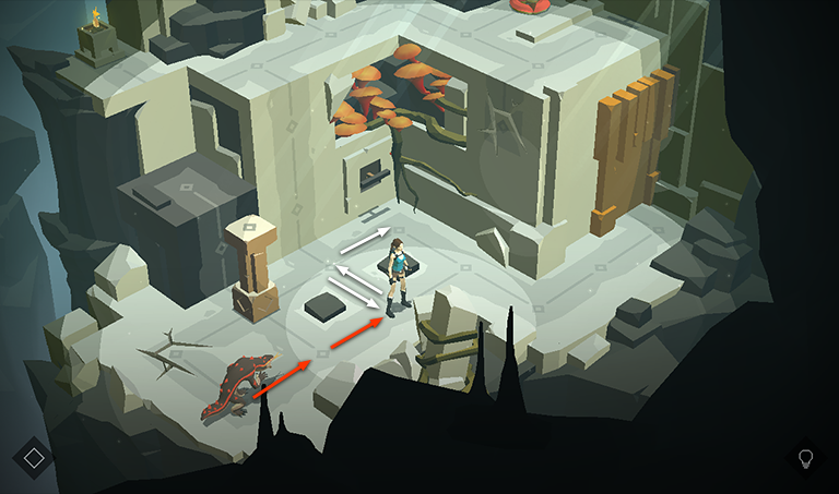 Then pull the switch by tapping/clicking the arrow icon on the floor. (If you're using a controller, hold Y/Triangle and move the left stick to pull the switch.) This opens the door off to the right. As you'll see, as soon as Lara moves again, the switch begins to retract and the door begins to close. You'll have six turns to reach it before it shuts completely. If that happens, you must to return to the switch and pull it again.