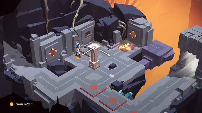 Move past the snake, grab the movable pillar and drag it one space toward the lower left. Do not pull the pillar again or Lara will step on the orange pad and get speared.