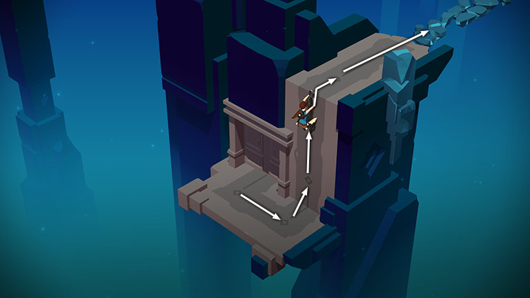 In the next small area, climb onto the ledge and step out onto the floating walkway. Lara runs across automatically.