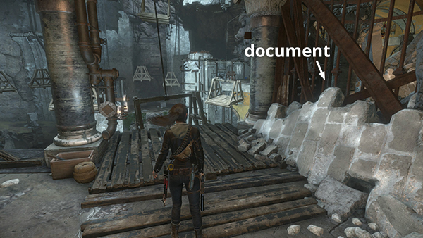 Go around to the far left corner of the pool (there are arrows here if you need them), and then jump across the raised platforms to the ledge on the far right. You'll find more arrows leaning against the wall behind a second winch. Before doing anything with that, jump up onto the stone wall that juts out beside the winch. Go around behind the wall to find a document (12/21), The Gulag Burns from Nadia's Grandfather's Journal (Russian) Climb back down to the second winch. Stand beside it and shoot a rope arrow into the second spool directly across the pool from here. This will allow you to raise the third platform, next to the spool, but don't bother doing that yet. (screenshots)