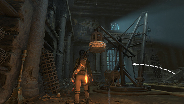 Now for the puzzle. The mechanism in the lower room has 2 rope-wrapped levers which together drain the water from the pool and open the round hatch, causing flammable gas to jet into the room. The hatch only stays open temporarily, however. There's also a cage submerged in the pool, a winch that Lara can crank with her axe, and a rope-wrapped counterweight off to the right.