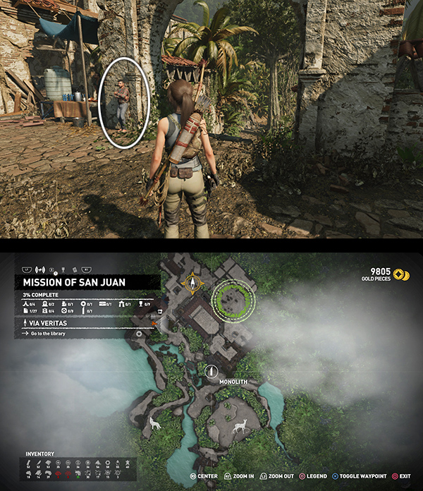 IMPORTANT: Exploring the Library advances the story and takes Lara away from the San Juan Mission. For specifics, skip down to the LIBRARY section, below. You'll be able to return to the Mission later via Fast Travel, but there's a lot you could do before this. I recommend waiting until you've covered most of the level before approaching Jonah.