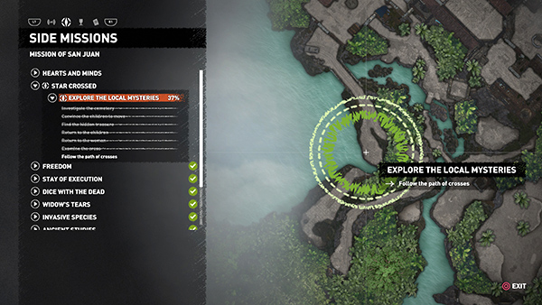 SIDE MISSION – STAR CROSSED (Explore the Local Mysteries): Before following the main story, speak to the mission giver, Guillermo, standing next to Sara. He explains that Isabela, another archaeologist and a special friend, has disappeared. She and Guillermo had a fight the night before and she hasn't been seen since. He suggests that Lara Investigate the Cemetery. Like all Side Missions, this one is optional, but it's required for 100% completion. It's also the only way to gain access to the level's single Crypt. The mission also takes you into one of the two Challenge Tombs and past a number of major collectibles, so this time I've included it in the main walkthrough. Details are below, after the bulleted list, below.