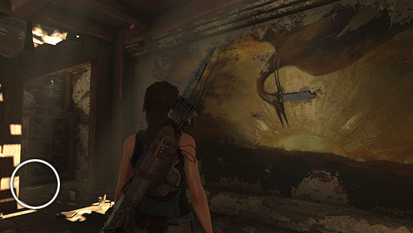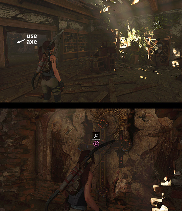IMPORTANT: Once you locate the cross and enter the basement, you won't be able to return to the Mission exterior until you've completed the level and and reached the next base camp. Before the end of the level you'll also have to get through a series of combat encounters. So if you have gold or skill points to spend, need to stock up on ammo and supplies, or just want to finish exploring the Mission, leave now and return when you're ready to move on.