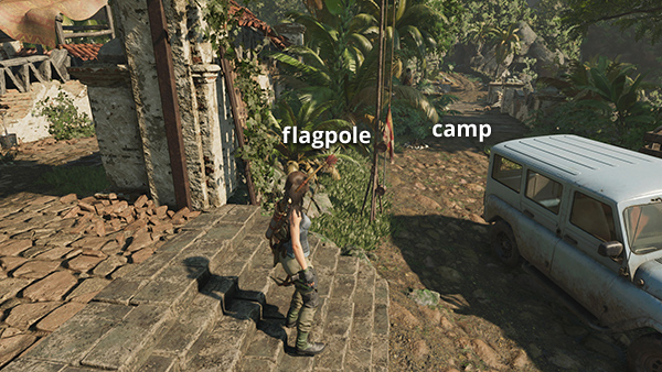 The first flagpole (1/5) for the Raise the Flags Challenge is just beyond where Sara and Guillermo are standing. Cut the release pulley with your knife to raise the flag and initiate the challenge. The locations of the other flagpoles are noted below and marked with red dots on the annotated level map.