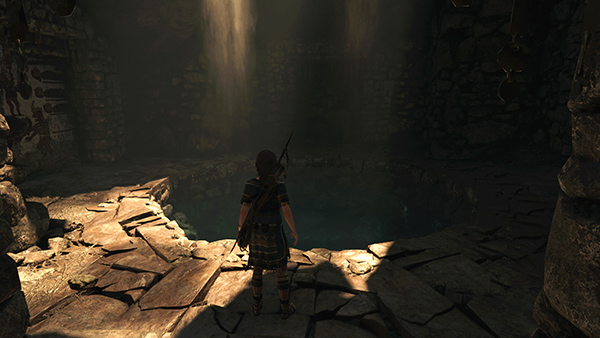 Continue to a round room with a pool of water below. Lara says it looks deep enough, but don't dive in. Instead examine the mural (14/23), Chuki, The Weaver (Quechua/Resting Places), on the right.