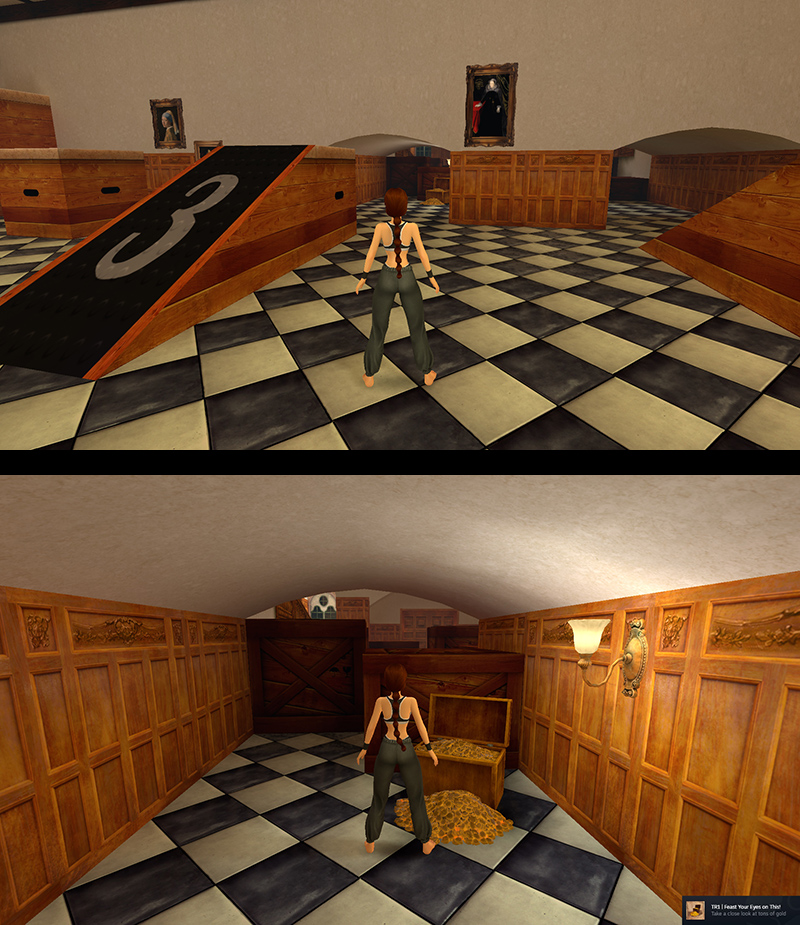Climb over the crates and enter the BALLROOM. Move Lara onto each of the numbered ramps in turn. Go slowly enough that you can hear her spoken instructions. This will make it easier to do what is needed to unlock "Welcome to My Home!" I haven't made screenshots, since Lara explains pretty clearly what to do, but be sure to do all steps in order. (Again, I use and teach tank controls, so check YouTube for modern controls if necessary.)