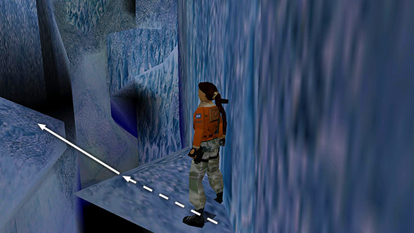 To set up the jump, step almost to the outer right corner of the ledge. (If you stand too close to the corner, Lara will clip it when she jumps and fall.) Face the target ledge and then hop back once.
