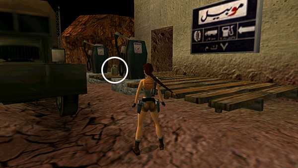 (3) NORTHWEST MASTABA: Head back the way you came and go between the two buildings where the first dog emerged. Approach the door of the building on the left and press Action to kick it open. Enter and pick up revolver ammo (3) in one corner (green dot on map). The trapdoor in this room is much more obvious. Stand near the handle and press Action to open it. Drop into the tunnel, advance a few steps, and kill a wild dog (5) that approaches from around the next corner. The shotgun works well in close quarters. Just ahead, the tunnel slopes upward, takes a turn to the right, then straightens out. When you pass this point, 2 more dogs (6-7) charge up the stairs toward you. Shoot them and continue to the room below. (screenshots)