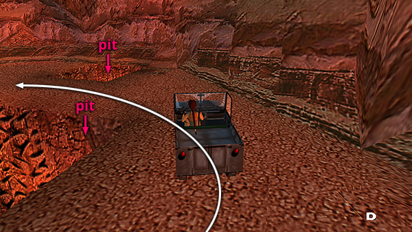 After obtaining secret #3 above the ramp with the rolling spikes, as shown in the previous section, drive on carefully to avoid the deep pit on the right at the bottom of the slope.