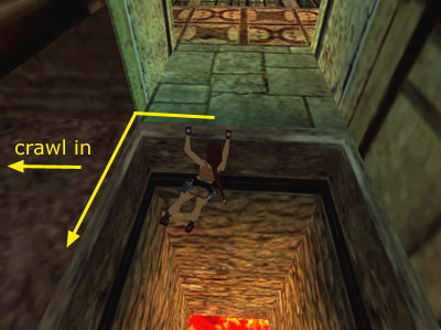 ROOMS WITH GRATING FLOORS/LION CAGES: The exit is closed. Hang from the doorsill above the lava pit. Traverse to the left and around the corner. Then pull up into the crawlspace (as shown in this screenshot). At the edge, press Jump to somersault into the small room below. Push the square button to open the exit from the room above the lion pit. Climb back into the opening and crawl backwards toward the opening, holding Action to drop and hang from the ledge above the lava pit. Traverse back around the corner and pull up. Go through the room with the grating floor and slide down the ramp.