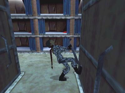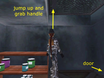 Cross the MESS HALL to the hatch in the far right corner. Turn the wheel (Action) to open the hatch. Follow the hall to a STOREROOM on the right. Kill the armed gangster (8) inside. Climb onto the crate to reach the trapdoor above. To open it position Lara at the edge of the crate facing the doorway (as shown in this screenshot). Jump straight up and grab the handle (Action). Climb into the duct above.