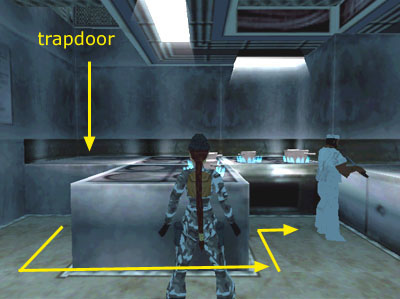 NOTE: If you accidentally attract the cook's attention and he attacks, either reload a saved game or climb back up into the duct. Crawl through to the next spot where Lara can stand up. Then crawl back to the open trapdoor and re-enter the kitchen. The cook should be back at work and you can try again.