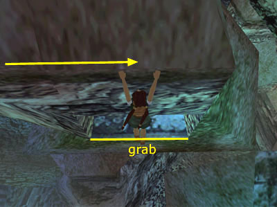 . . . until Lara is hanging above a small, rectangular opening. Let go then immediately press Action to grab the edge of the small opening. Pull up and crawl through.