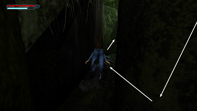 If Lara falls into one of the first two pits, either reload or kill the rats—assuming Lara will even target them—climb back out, and continue. The first pit has one root-covered wall Lara can climb. (screenshot) If you fall into the second pit, you may be able to stand on the rubble and jump up to grab the uneven ledge above (screenshot), but this is tricky. You can also crawl through the low tunnel to get back to the first pit, then climb the root-covered wall.