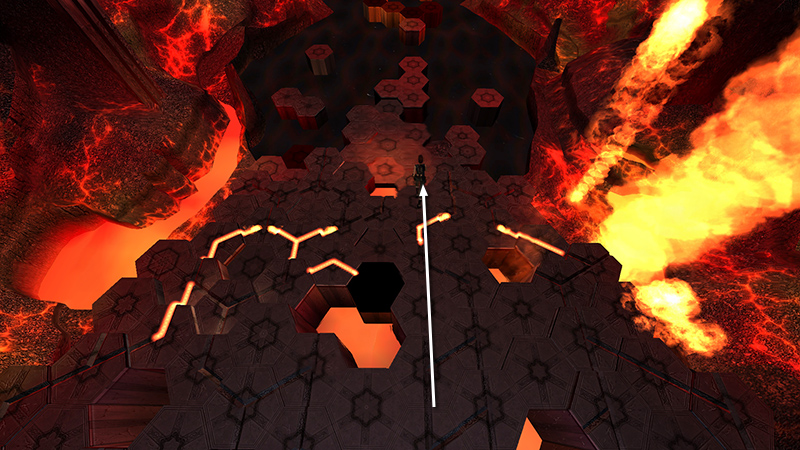 At the bottom, run out to the end of the central cluster of hexagonal blocks. Without stopping, steer slightly left at the end...