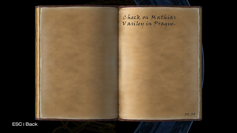 7 Mathias Vasiley in Prague. Has sent me four Obscura Engravings. He kept the fifth Engraving back. Wants more money. [includes image] Margot Carvier's Apartment screenshot
