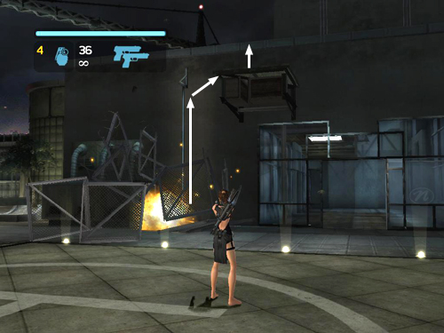 Face the door where you just came out, stand back a bit and use the pistols to shoot the fuel barrel in the storage cage beside the door. (screenshot) After the explosion, a vertical pipe is now accessible. Climb to the top and jump to the ledge on the right. From there, climb onto the roof.
