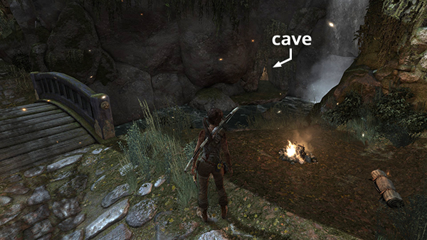Just beyond the camp is a waterfall. To the left of it there's a small cave opening. Squeeze inside to find a lantern where you can light your torch if you like, plus a salvage crate and a document (1/2), "Stranded," part of the Diaries of a Madman set. (screenshot) Exit the cave and climb back up to the camp.