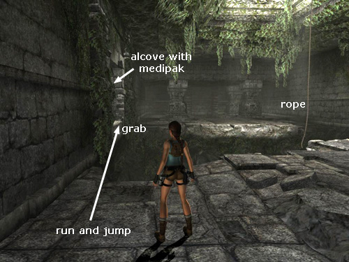 If you didn't already get the large medipack in the raised alcove on one side of the bear pit, do that now, either using the rope (as described above) or by taking a running jump along the ledge near the wall to grab the edge of the alcove (as shown in this screenshot). Once you've obtained the medipack, drop back down into the pit, climb back up the handholds to the ledge and once again jump to grab the rope.