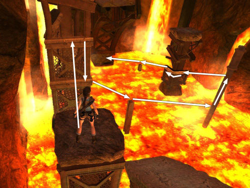 If Lara is too far to the left or right before swinging around the bar, she'll miss the next grab and fall into the lava. So adjust her position so she's hanging directly in front of the nearest corner of the ramp. (Again, check the screenshots if you're not sure.) Swing around the bar, jump onto the ramp, slide just a little bit and jump to grab a handhold on the support pillar ahead. From there, climb straight up to the top of the pillar.