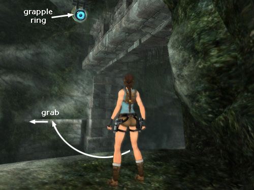 Use the metal ring above to grapple-swing across the gap to the narrow handhold on the far wall.