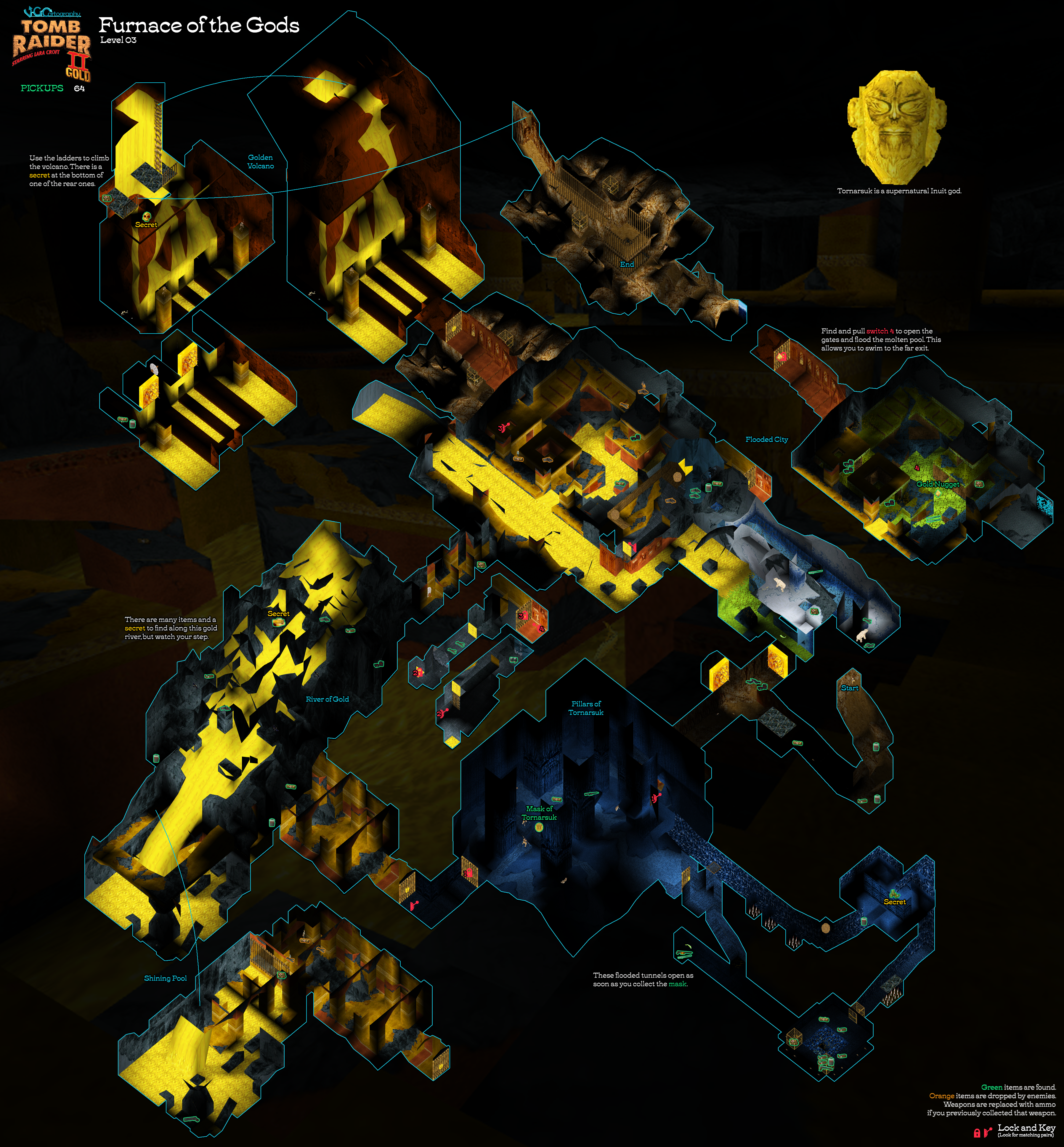 Secrets: 3 Pickups: 64, including the Mask of Tornarsuk, gold nugget, and 3 secrets Kills: 38 (41)
