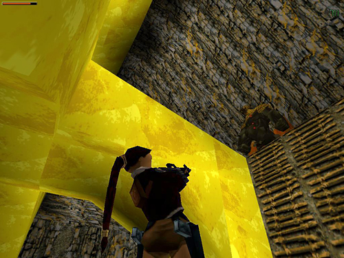 TREES AND WOODEN BRIDGES ABOVE GOLDEN POOLS: Climb the rocks to the orange opening. When you take the large medi pack (21) near the skeleton, 2 sasquatches (10-11) charge up the hill. Shoot them as they approach. Then jump down to the flat area ahead on the right. Watch out for the pit of molten gold. Take a standing jump up to the flat spot in the center of the blocky clump of trees. Inside the trees, go forward then left. Draw weapons as you move to the edge of the opening and shoot a third sasquatch (12) as it runs toward you. For some reason, it's able to withstand the heat of the bubbling pool. (screenshots)