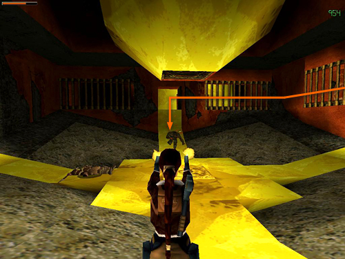 Step off the orange ledge and slide down the slope to land on a flat spot below on the right. Take a running jump across the flowing stream of gold to the next flat square. Position Lara at the CENTER of this square and turn about 45 degrees to the left. Take a standing jump to the more or less flat spot in the lower middle of the golden slope. Turn so the pool of molten gold is ahead and to Lara's left. Take a standing jump from the back of the flat square to another flattish spot two squares ahead, at the bottom corner of the slope. Turn just a little to the right. Then set up and take a running jump to the flat block on the other side of the golden stream, one square higher and to the right. Do not press Action while in the air or Lara will fall short.